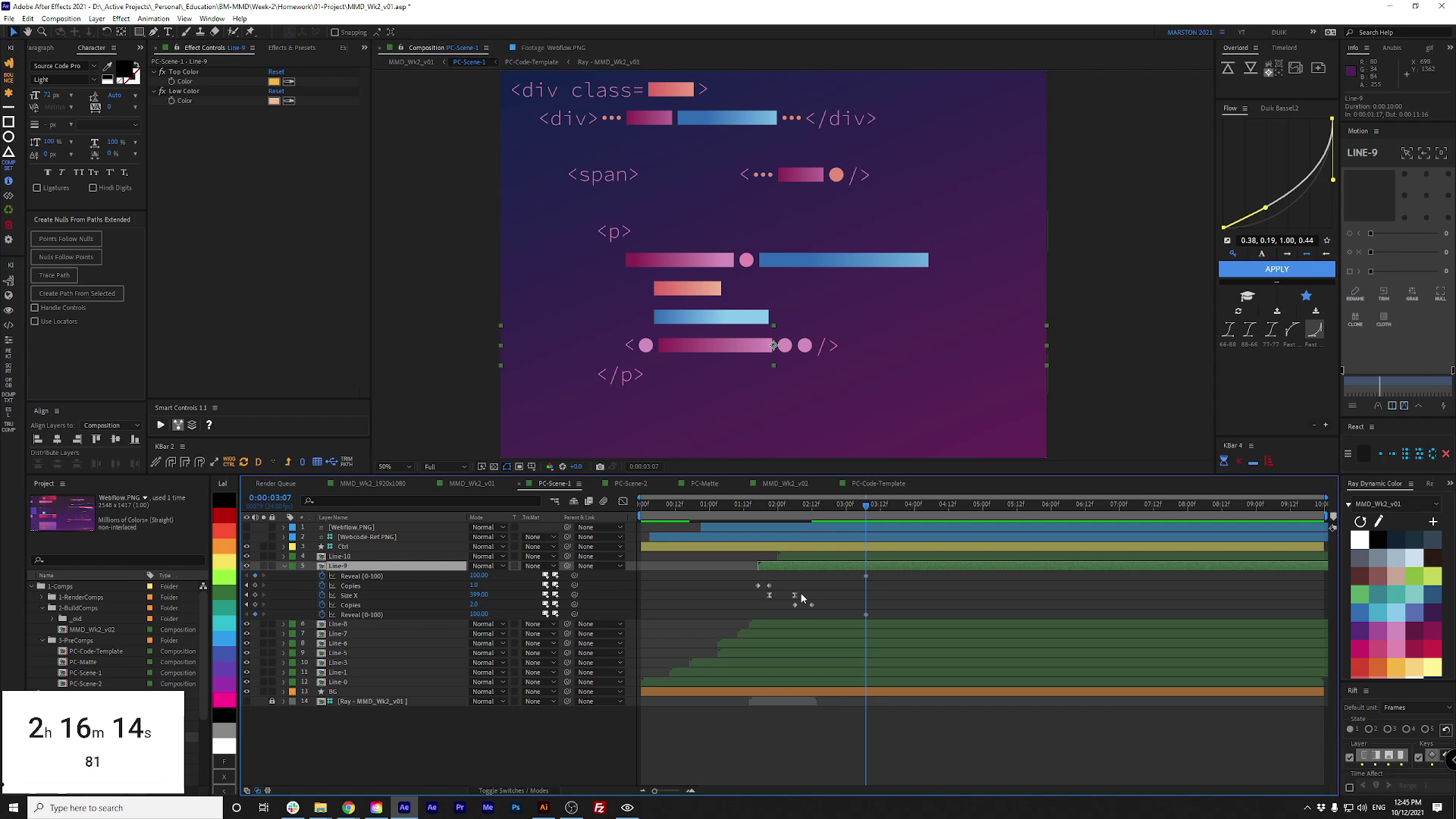 To create the code, it was more practical to develop a master template comp in After Effects for one line of code using expressions and Essential Graphics than to design each line on its own. Each element of this template line can be turned on or off and customized in the main comp. This made generating all the unique snippets seen in the final render a quick process of duplicating and customizing the template comp.